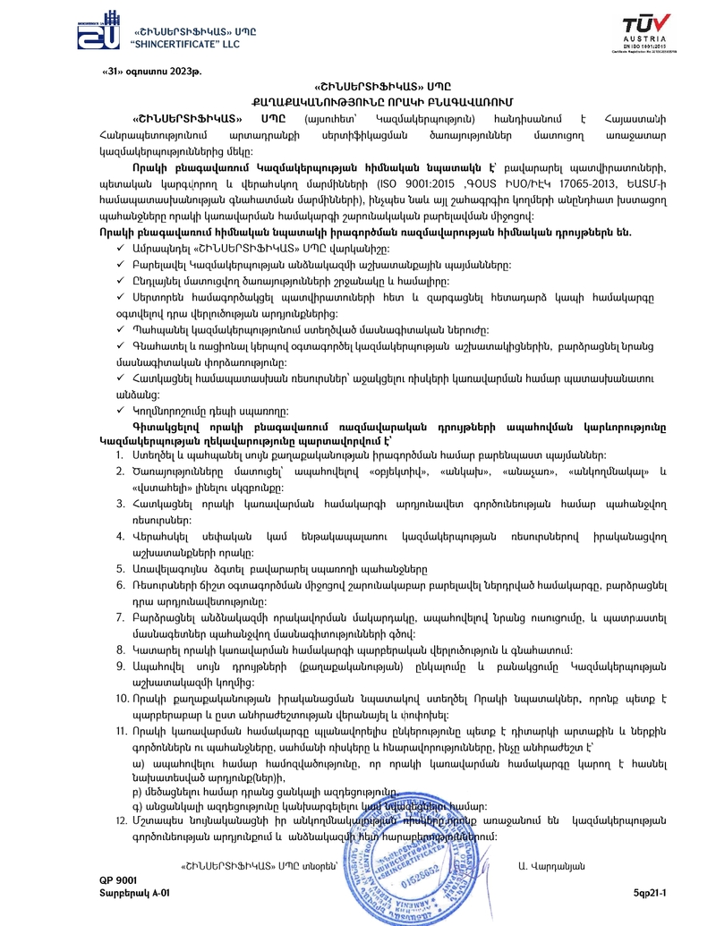 «Շինսերտիֆիկատ» ՍՊԸ ունի ներդրված Որակի կառավարման համակարգ (ՈԿՀ), որը 2009 թվականի օգոստոսի 27-ից սերտիֆիկացվել է միջազգային ճանաչում ունեցող գերմանական TUV NORD CERT GmbH սերտիֆիկացման մարմնի կողմից, իսկ 2022 թվականի մարտի 2-ից ավստրիական TUV AUSTRIA CERT GMBH սերտիֆիկացման մարմնի կողմից՝ ըստ ԻՍՕ 9001 միջազգային ստանդարտի պահանջների:
