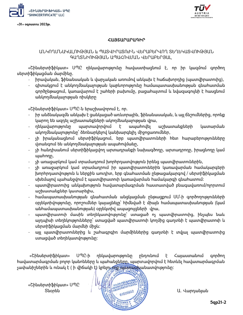 «Շինսերտիֆիկատ» ՍՊԸ ծառայությունները մատուցում է ապահովելով օբյեկտիվ, անկախ, անաչառ և վստահելի լինելու սկզբունքը: